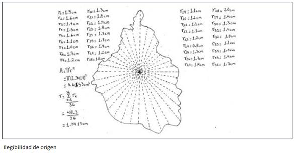 María usa esta técnica para calcular el área del terreno plano, traza radios a puntos “arbitrarios” y se guía por los vértices que representa la figura, adaptándola “no muy fortuitamente” (ver figura 36). Horacio la usa para calcular el área de la Ciudad de México, tal como se describió más arriba y como usa en Topografía, trazando los 36 radios, promediando y calculando el área de la circunferencia (ver figura 37).