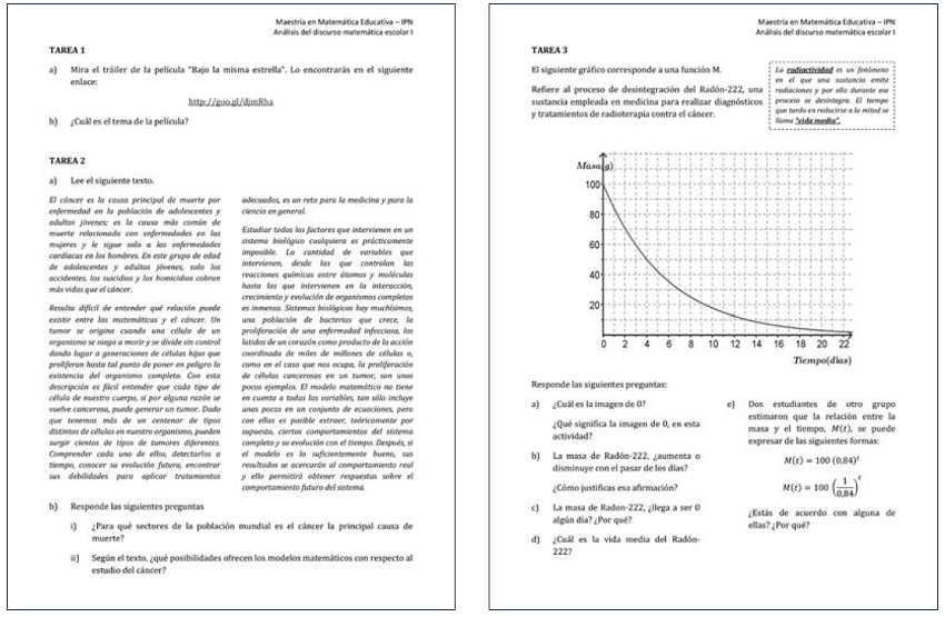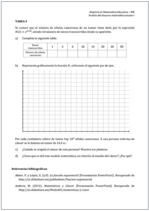 Como se observa, este equipo de profesores contextualizó la función exponencial en la medicina, particularmente en el tratamiento del cáncer. Para ello, buscan acercar a los estudiantes a este contexto a través del tráiler de una película y de una lectura (tareas 1 y 2). En las tareas 3 y 4 se presenta la exponencial como un modelo matemático de tiempo de vida del Radón 222 y el crecimiento de células cancerígenas. Se observa que estos modelos sólo representan una parte de los comportamientos del Radón 222 y del crecimiento de células cancerígenas y que un análisis más fino es necesario para asegurar el uso real de los modelos en medicina. Sin embargo, estos profesores comienzan a buscar tareas en contextos extra-escolares (de la vida) para dar sentido a la enseñanza del modelo exponencial.