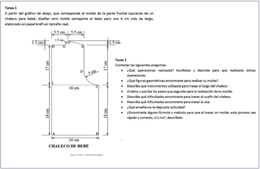 Por su parte, el equipo 2, planteó un diseño basado en el contexto de corte y confección, como se observa en la figura 40. La actividad está planteada para estudiantes de nivel secundaria y bachillerato. Los conocimientos que se pretenden movilizar son los de proporcionalidad. Sin embargo, la técnica óptima no se apoya en la proporcionalidad ya que no se trata de hacer un dibujo a escala, sino de trazar un dibujo en el que la longitud varía, pero no proporcionalmente. La tarea propuesta, sin embargo, permitirá generar técnicas matemáticas y no-matemáticas (por ejemplo, cómo determinar la sisa y el cuello si se modifica la longitud del chaleco) validadas por conocimientos contextuales (de corte y confección).