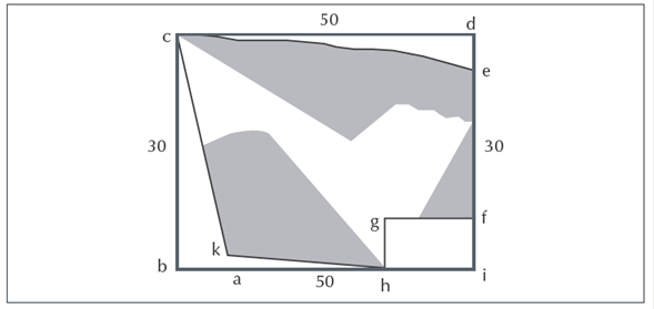 Como si fuese un pedazo de tierra que contenga una laguna de agua, de tal manera que se denota la figura abcd (Figura 4), haz un paralelogramo colocando tu instrumento a la redonda de manera que quede dcbi (Figura 5). Supongamos que este paralelogramo que circunscribe o abarca la tierra tiene por un lado 50 tamaños (sean varas o palos o lo que quieras) y por el otro 30. Mídela con tu regla y será 1500 y tantos tamaños o cantidades cuadradas. Mide después por la regla del triángulo la cantidad que hay entre la línea bc y el final de la tierra akc y lo que vieras entre kah y entre ihgf y entre edc. Lo que obtuvieras de restar con el paralelogramo y lo que queda, será el área de dicha tierra y de este modo se medirá cualquier otra forma. (Pérez de Moya, 1573, p. 186)