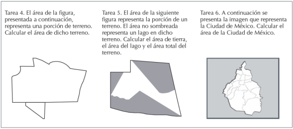 Se analizaron praxeologías matemáticas en libros de educación media superior (Fuenlabrada, 2007; Velasco, 2010; Zamora, Vázquez y Sánchez, 2007; Zúñiga, Zúñiga, y Zúñiga, 2012). En la mayoría se identificaron tareas para el cálculo de áreas de figuras “conocidas” (triángulos, cuadriláteros o circunferencias) y polígonos irregulares compuestos por estas figuras. Las técnicas predominantes favorecen el cálculo a través de la aplicación de fórmulas y la validación estaba relacionada con el uso ade- cuado de dichas fórmulas. Sin embargo en Zamora, et al. (2007) se identificó la praxeología para el cálculo de área de la Ciudad de México. Tarea no matemática justificada con técnicas mate- máticas pero con validaciones (tecnología) de naturaleza topográfica.