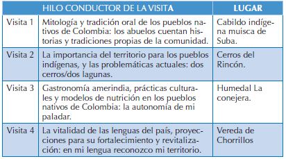 La Tabla 2 presenta los hilos conductores sobre los que estuvieron basadas las visitas realizadas por los estudiantes (cada una tuvo una duración de cuatro horas), en ellas se sucedieron diálogos intergeneracionales, participación en actividades tradicionales y recorridos guiados por territorios ancestrales.