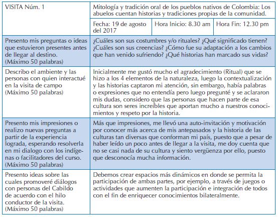Para cada una de las visitas, adicionalmente fue estructurado un registro individual, a manera de diario de campo, que debían cumplimentar los estudiantes después de su participación. Estas visitas contaron con el acompañamiento directo de dos de los profesores del curso: una gestora cultural y un lingüista experto en bilingüismo en las lenguas nativas de Colombia.