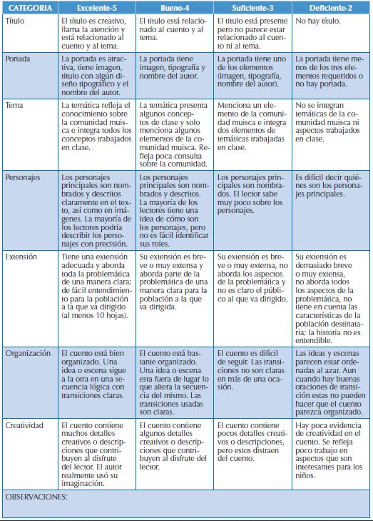 Como se mencionó anteriormente, el principal desempeño o producto esperado por parte de los estudiantes al finalizar el curso residía en la elaboración inédita de un cuento o historia, vinculada con la experiencia de interacción con la comunidad indígena muisca y con el acompañamiento directo del equipo de profesores, referido principalmente a la contextualización histórica y cultural de la comunidad; a la fundamentación en la composición de textos; a la referenciación de la literatura infantil y juvenil como canal de comunicación; al significado del espacio y el color en las ilustraciones, entre otros.