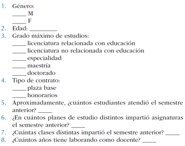 Además de recabar datos generales, el presente cuestionario tiene como propósito obtener información al respecto de las expectativas de autoeficacia docente de las y los profesores de la universidad. Dados los fines investigativos del estudio, le pedimos sea tan amable de responder con absoluta verdad.