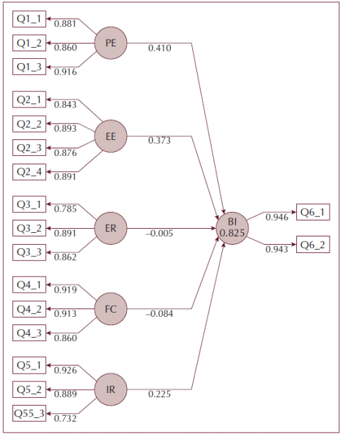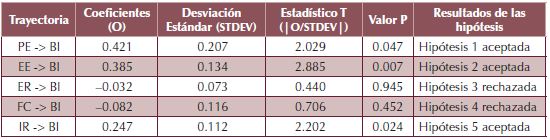 Los coeficientes de trayectoria entre los constructos deben ser superiores a 0.2, para que sean estadísticamente significativos, al igual que sus valores de p. En el modelo estructural completo, como se muestra en la Tabla 5, los coeficientes de EE, IR y PE mostraron ser significativos para BI.