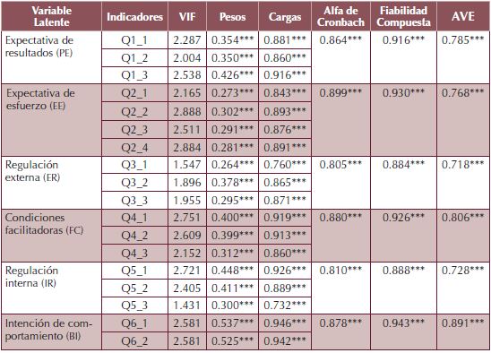 La evaluación del modelo se concentra en los modelos de medición, para constatar la confiabilidad y validez de las medidas de construcción. Para cada uno de los constructos en este estudio se emplearon diversas variables adaptadas de la bibliografía (Apéndice A). De acuerdo con Hair et al. (2014), para una evaluación inicial del modelo SEM-PLS es necesaria una evaluación de los modelos de medición reflexiva, antes de proceder con la evaluación del modelo estructural. La Tabla 2 proporciona la evaluación de las variables latentes.