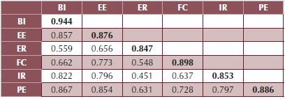 Un enfoque conservador para evaluar la validez discriminante es mediante el uso del criterio de Fornell-Larcker. Solo los constructos reflexivos se pueden evaluar de esta forma. Este enfoque particular compara la raíz cuadrada de la varianza promedio extraída (AVE) con las otras correlaciones de la variable latente dentro del modelo. Por lo tanto, la raíz cuadrada de cada AVE de la variable latente debe ser mayor que sus correlaciones con otras variables latentes. La Tabla 3 muestra las correlaciones y establece la validez discriminante de acuerdo con este enfoque.