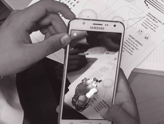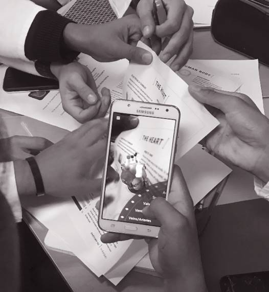 La intervención se dividió en cuatro fases, cuya programación respondió al método de investigación-acción (Restrepo, 2004), que comprende tres etapas: la reflexión del problema que se requiere transformar (empleo de nuevas TIC en la enseñanza de Anatomía y Fisiología); la recolección de información sobre el contexto (cuestionario TAM y escalas estimativas); la aplicación de acciones renovadoras (realidad aumentada y realidad Virtual). En la primera fase se realizó un diagnóstico. La evaluación consistió en una primer práctica con la ayuda de la aplicación Anatomy 4D (versión para Android) y un aula tipo STEM (Science, Technology, Engineering, Math). Anatomy 4D permite visualizar todos los sistemas y aparatos anatómicos del ser humano, mediante el uso de la RA. El sistema emplea una serie de marcadores o triggers, los cuales son gratuitos y descargables en la página oficial de la aplicación; hasta el momento sólo existen dos, una donde se visualiza el ser humano completo y la otra en donde se puede ver el corazón y sus funciones (Fotografía 1).