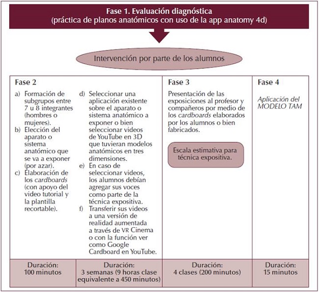 La segunda fase consistió en la elaboración de un proyecto virtual, cuyo objetivo fue explicado por el profesor: exponer la estructura anatómica y funciones esenciales de algún aparato o sistema anatómico seleccionado por el docente al azar. Posteriormente se señaló que la exposición debería ser bajo un modelo tecnológico de RA o RV, a través del uso de aplicaciones predeterminadas para RA o la RV en las diferentes plataformas de software para móviles (IOS o Android), como VR cinema o VR cinema player. Se dividió el grupo en equipos de siete u ocho personas, estructurados por decisión de los participantes. La técnica que se empleó fue a través de una herramienta denominada Cardboard, la cual fue creada por los educandos bajo las indicaciones del profesor. Los cardboard son una plataforma de realidad virtual (VR), desarrollada por Google sobre la base de cartón plegable -de allí su nombre- que funciona a partir de un teléfono móvil con sistema operativo Android o IOS (Dougherty, 2015).