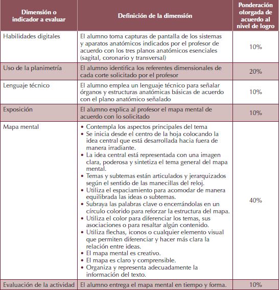 Se crearon dos escalas estimativas: la primera, para evaluar la práctica de diagnóstico, y, la segunda, para la exposición del proyecto en RV. De manera general, la primera de ellas se estructuró de acuerdo con las competencias deseadas para el alcance de los aprendizajes esperados. Su objetivo fue diseñar un mapa mental mediante capturas de pantalla establecido por el docente, a través del uso de la realidad aumentada. Dicha escala estuvo conformada por seis dimensiones; cada dimensión fue definida y ponderada según el nivel de logro del estudiante (las especificaciones a detalle se muestran en la Tabla 1).