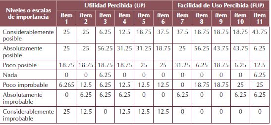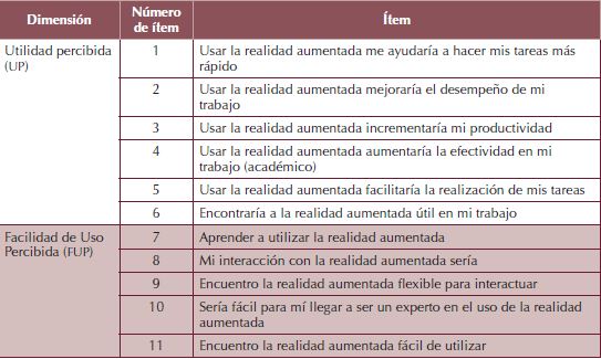 El modelo TAM (Technology Acceptance Model) original (Davis, 1989) evalúa dos dimensiones que permiten predecir el uso de las TIC: la utilidad percibida (UP) y la facilidad de uso percibida (FUP), con un total de seis y cinco ítems respectivamente. La UP se refiere al grado en que una persona cree que, usando un sistema en particular, mejorará su desempeño en el trabajo. La FUP indica hasta qué grado una persona cree que, usando un sistema en particular, realizará un menor esfuerzo para desempeñar sus tareas. Con base en el modelo TAM, se empleó una escala Likert adaptada por Davis (1989), con siete niveles o escalas de importancia: considerable y absolutamente improbable, poco improbable, nada, poco, absoluta y considerablemente posible. El análisis se realizó a través del software Excel, donde se realizó una tabla de frecuencias, para obtener y analizar la tendencia de la aceptación de la realidad aumentada en los alumnos. Los ítems del cuestionario TAM se muestran en la Tabla 3.
