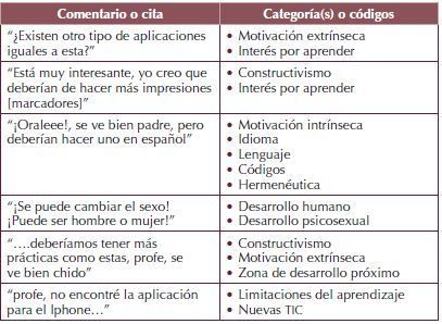 En la primer fase de la investigación se indagaron las impresiones de los alumnos mediante un diario de clase, que Zabalza (2004) define como una narración realizada por los docentes, de tal manera que el marco de la información tiene por objeto de estudio los hechos ocurridos en el aula y durante el momento de la clase. El registro de datos fue al momento de realizar la práctica de planimetría del cuerpo humano y del corazón; la pregunta detonadora fue ¿qué impresión te dejó esta práctica? Algunos de los comentarios obtenidos que se consideraron de mayor significancia son presentados en la Tabla 1, dichos datos fueron codificados y asociados a categorías centrales, mediante el uso del software Atlasti (Versión 1.0.50 para Macintosh), asimismo se realizó una red semántica sobre el análisis de la unidad hermenéutica. Se recibieron un total de 27 comentarios. Los criterios empleados para la discriminación de los mismos fueron: comentarios directos de la app, sensaciones producidas por su uso y evaluación de la clase. Los seleccionados se muestran en la Tabla 4.