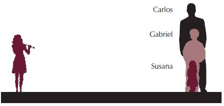A Carolina, que vive en una ciudad donde nieva, le encanta tocar la flauta. Tal es así que, cierto día por la mañana, cuando ya alumbraba el sol, pero aún había nieve en el suelo, decide realizar el siguiente experimento con sus hermanos Susana, Gabriel y Carlos. Los sitúa uno tras otro a la misma distancia de ella, mientras interpreta una pequeña obra musical, como muestra la Figura. La estatura de Carolina es 1.5 m, la de Susana, 1.2 m, la de Gabriel, 1.5 m y la de Carlos, 1.8 m.