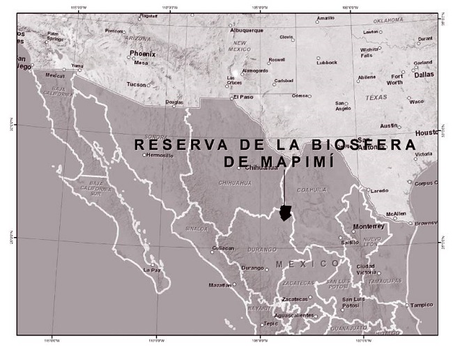 El video pedagógico se desarrolló principalmente en la zona protegida dentro de la región desértica representativa del Bolsón de Mapimí en el altiplano mexicano, conformado por cuencas endorreicas con una altura comprendida entre los 1000 y 2400 m y llanuras desérticas, denominadas bolsones. El endorreísmo en el desierto del norte de México, se manifiesta por la presencia de numerosas lagunas, algunas de las cuales pueden alcanzar hasta 50 km de longitud después de la temporada lluviosa, como los remanentes de las de Mayrán, Tlahualilo, Bustillos, Patos y Palomas (Álvarez, 1961). La zona de la reserva de la biosfera de Mapimí abarca los estados de Durango (62.89%, superficie), Coahuila (22.45%) y Chihuahua (14.67%), y cubre una superficie total de 342387 hectáreas (Conanp, 2006. Figura 1). Esta reserva tuvo su origen a raíz de la excesiva frecuencia de turistas (atraídos por el mito de la existencia de una “zona del silencio”) y la degradación del ecosistema, que en parte amenazaban ciertas especies endémicas, como la tortuga del bolsón Gopherus flavomarginatus (García Gutiérrez et al., 2006; Kaus, 2003).