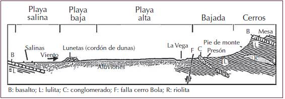 En resumen, la geología local se caracteriza por las zonas de bloques montañosos (cerros) con desarrollo de depósitos de pie de monte (bajadas), asentados sobre roca volcánica y sedimentaria del terciario (Figura 3); con presencia de grandes extensiones o planicies de depósitos del cuaternario (playa alta, baja y salina) y una zona inundable con sedimentos lacustres y eólicos (Grünberger, Reyes-Gómez, y Janeau, 2004). El régimen climático prevaleciente es del tipo árido muy árido, con promedio anual de precipitación de 277 mm, con extremos secos de 80 mm y lluviosos de 515 mm. La temperatura media anual es del orden de los 18.9°C, con extremos de 3°C en el invierno y de 42°C en el verano (García, 2003).