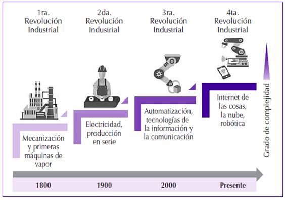 Las revoluciones industriales -representadas cronológicamente en la Figura 1- han marcado en gran medida la evolución y transformación de la humanidad, llevando al hombre a adaptarse a diversos cambios (Salas, 2016). En la primera Revolución Industrial, entre los siglos XVIII y XIX, se mecanizaron los procesos de producción, transformando la economía agraria y artesanal en otra liderada por la industria (Del Val, 2016). La segunda Revolución Industrial (1870) implantó las líneas de producción en la planta, con reducción en los tiempos de los procesos y se organizó la producción masiva de lotes de productos con características idénticas. También se introduce la generación de la electricidad y se producen los motores eléctricos como unidades de potencia en los sistemas de manufactura (Carvajal, 2017). La tercera Revolución Industrial se basó en las tecnologías de la información y comunicación, así como en las innovaciones que permiten el desarrollo de energías renovables. Nunca antes se había logrado el nivel de interactividad o intercomunicación que beneficiara en diferentes estratos a nuestra sociedad, educación e industria (Swain, 2017). La cuarta Revolución Industrial está creando un enfoque centrado en ecosistemas digitales, es decir, está generando modelos de negocios innovadores basados en la interconexión de millones de consumidores, máquinas, productos y servicios (Escudero, 2018), por ende, está caracterizada por el Internet de las cosas, robótica, nanotecnología e inteligencia artificial.