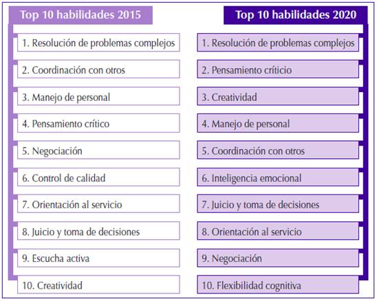 Según el informe The Future of Jobs: Employment, Skills and Workforce Strategy for the Fourth Industrial Revolution del Foro Económico Mundial (Pernías, 2017), las habilidades, que los nuevos empleos van a exigir, están en constante cambio. Además de las habilidades específicas de cada sector o categoría profesional, existe un cuerpo de habilidades genéricas o transversales que no dependen exclusivamente de un sector o cuerpo de conocimiento, sino que deben ser desarrolladas en todos ellos. La Figura 2 muestra de manera comparativa las habilidades solicitadas en 2015 con respecto a las que se solicitarán en 2020. Destacan la aparición de la inteligencia emocional y la flexibilidad cognitiva, así como dar prioridad a la resolución de problemas complejos, pensamiento crítico y creatividad, las cuales deben vincularse con las profesiones de las áreas STEM+A.