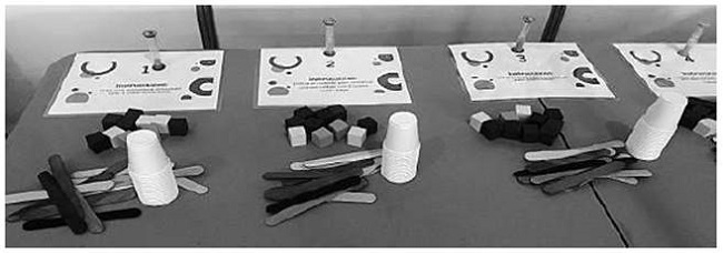 En la Figura 3, se muestra que los elementos utilizados para esta actividad son palitos o cubos de madera, vasos de plástico, relojes de arena con diferentes tiempos, descripción de retos y mesa de trabajo.