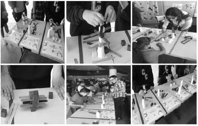Gracias al interés de diferentes organizaciones, el taller Retos de Ingeniería fue invitado a participar en la Semana Nacional de la Ciencia y Tecnología 2017, realizada en Museo Sol del Niño, en Mexicali, Baja California; foro que año con año invita a niños y jóvenes a conocer las múltiples posibilidades que ofrecen las áreas de la ciencia en los campos de la actividad productiva, la investigación científica y la docencia. En esta actividad participaron proyectos realizados por alumnos de educación media superior, superior y posgrado, y acudieron niños y jóvenes de primaria y secundaria. En esta presentación, se trabajó con niños y jóvenes con capacidades diferentes, como lo es el trastorno del espectro autista (TEA). Se puede apreciar en la Figura 6 que los estudiantes se mostraron entusiastas al realizar cada uno de los retos, utilizando su imaginación para la creación de estructuras y trabajando bajo las indicaciones expuestas. Tuvieron una experiencia vivencial, en la cual expresaron su entendimiento acerca de los elementos proporcionados, el manejo del tiempo y el espacio, el respeto por el trabajo individual y el de sus compañeros, así como la comunicación entre ellos. Para los niños y jóvenes con TEA, el colorido de los elementos y el apoyo visual, en donde pudieron apreciar las instrucciones de cada uno de los retos, favoreció el interés por participar de la actividad, al igual que su desarrollo.