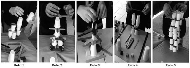 En la Figura 8 se presenta cada uno de los retos cumplidos de izquierda a derecha. En el primer reto, se puede apreciar que la estructura es de menor tamaño, así como la cantidad de material utilizado. El tiempo asignado es poco, por lo que permite que se familiaricen con las instrucciones y perciban las propiedades de los materiales en la estructura. En el segundo reto, la cantidad de material utilizado es mayor, y las estructuras realizadas han incrementado en dificultad y precisión. Igualmente, se empiezan a incluir los diseños que son explicados por ellos mismos. El tercer reto, manifiesta un uso del material mucho más eficiente, los estudiantes son más cuidadosos del orden en la colocación de los elementos. En el cuarto reto, algunos estudiantes tienen dificultad para identificar el concepto de balanza; una vez explicado, buscan utilizar los elementos que les proporcionan más estabilidad a las estructuras. El tiempo asignado al último reto permite a los estudiantes realizar diferentes pruebas para encontrar los puntos de apoyo más adecuados, la manera más eficiente de utilizar el material y poder generar así la estructura más alta. Se pudo observar que un determinado grupo de estudiantes colocó cubos de madera dentro de los vasos de plástico para darle estabilidad.