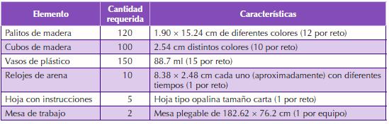 Descripción de la actividad didáctica. El instructor dispone el material en las mesas de trabajo, explica las reglas e instrucciones a seguir, organiza los equipos y debe llevar el control del tiempo, verificando que, al término del mismo, los estudiantes dejen de utilizar el material y revisar que las estructuras cumplan con los criterios establecidos en un principio.