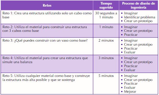 Por lo anterior, Retos de Ingeniería es un material de apoyo didáctico que cumple con el objetivo de llevar a la práctica conceptos básicos de ingeniería, como estabilidad y equilibrio, así como interactuar con diferentes propiedades de los materiales, como la fragilidad, dureza y resistencia, a través de la creación de soluciones basadas en el proceso de diseño de ingeniería.
