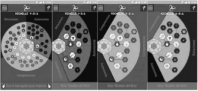 Consecuentemente, se definió el eje teórico central del enfoque de motivación sobre la base de la Self Determination Theory (SDT), de tal manera que la interfaz se diseñó sobre tres grandes zonas: 1. Autonomía, 2. Relacionamiento, 3. Competencia. En dicho sentido se desarrolló el ejercicio de programación de la aplicación mediante un diagrama de árbol de decisión radial, que permitía tener una visión clara de tres zonas de actividades relacionadas con las necesidades motivacionales de la SDT, y dentro de cada una de estas zonas encontrar un esquema jerárquico de organización de dichas actividades en la relación actividades-padre, actividades-hijo y actividades-nieto. En la siguiente sección se presentan los detalles del diseño y programación de la aplicación.
