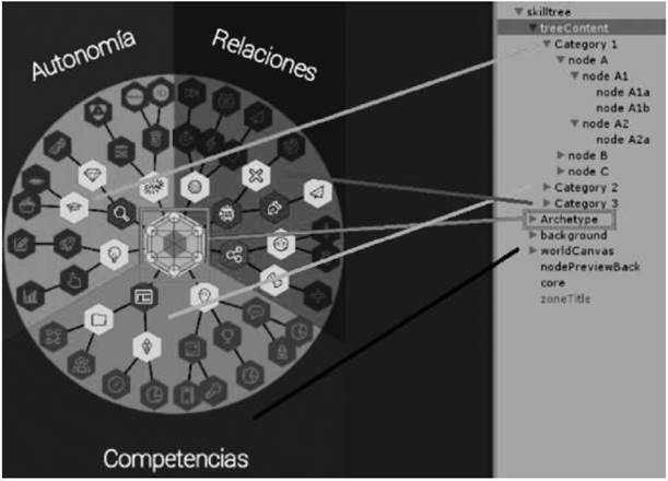 El objeto skilltree es una representación que permite secuenciar un listado de actividades que deben ser realizadas por el usuario. Se caracteriza por tener tres regiones claramente demarcadas que representan una intencionalidad distinta en el tipo de actividades relacionadas. Específicamente es un diagrama de árbol de decisión radial compuesto por varios nodos hexagonales; cada uno representa una actividad.