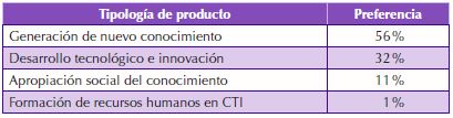 Los productos de investigación científica sobre los que se realizó la indagación corresponden a los propuestos por el modelo del Sistema Nacional de Ciencia, Tecnología e Innovación: 1) generación de nuevo conocimiento; 2) desarrollo tecnológico e innovación; 3) apropiación social del conocimiento; 4) formación de recurso humano.