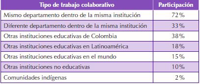 Un aspecto que es importante resaltar como fortaleza para la consolidación de una cultura de la investigación es una tendencia marcada a trabajar de manera colaborativa en los proyectos de investigación, lo que genera visiones ínter y multidisciplinares de los problemas trabajados y una mayor capacidad de gestión de los resultados y productos de la investigación. Los resultados se aprecian en la Tabla 2.
