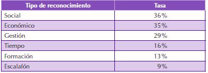 Es importante tener en cuenta que los aspectos que destacan son el reconocimiento social y el reconocimiento económico (36 % y 35 % respectivamente).