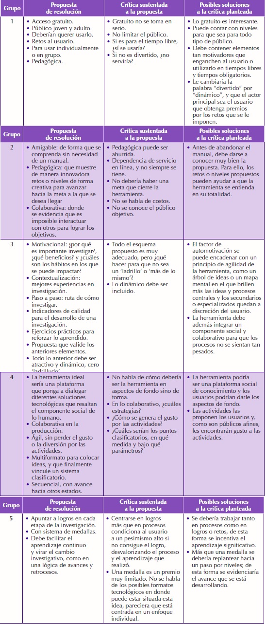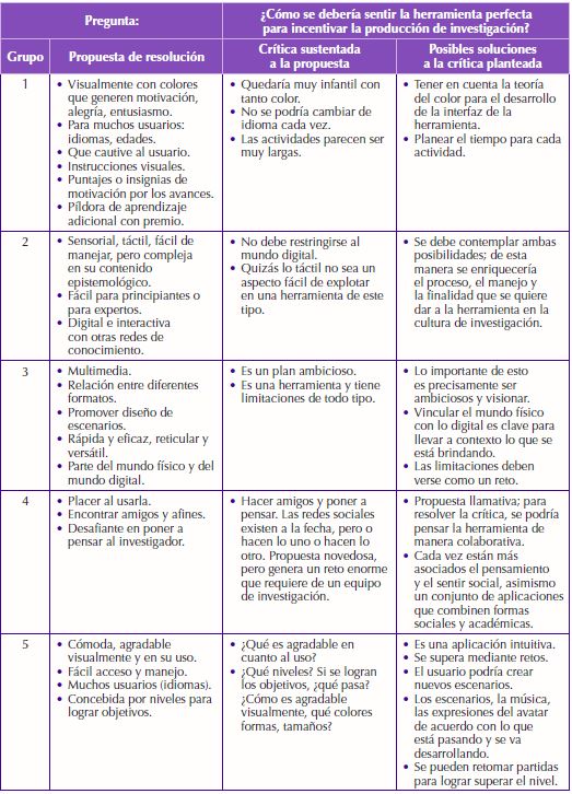 Con relación a la primera pregunta, se identifican aspectos importantes como la necesidad de que sea una herramienta tecnológica, de fácil manejo, divertida y dinámica. Asimismo, se sugiere que sea de acceso fácil y pueda usarse en diversos dispositivos, que presente medios en diferentes formatos (multimedia) y que brinde rutas o caminos a los investigadores, un paso a paso de qué debe hacer para lograr los objetivos y obtener premios por la superación de retos planteados. La Tabla 5 resume el trabajo con los grupos.