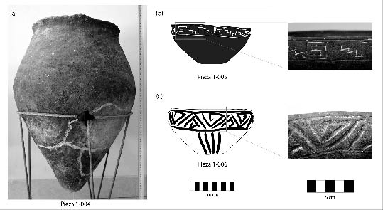 Abstract: A funeral context consisting of a burial in an urn was reconstructed from archaeological material collected during investigations carried out in the commons of the town of Saujil, currently in possession of the Pereira family (Tinogasta Department, Catamarca). Two simple bowls were found inside an undecorated pot. The bowls were attributed to the Famabalasto Negro Grabado (FNG) and Belén styles on the basis of their morphological and visual characteristics. Designs on both ceramic pieces consist of incised and excised grooves filled with a whitish substance. The filling material was sampled and the composition analyzed by X-ray diffraction and Raman spectroscopy. The results obtained are presented in correlation with studies of FNG vessels from sites in the southern sector of the Calchaquí Valley. Finally, the significance of these pieces is discussed in the context of the southernmost sector of northwest Catamarca.