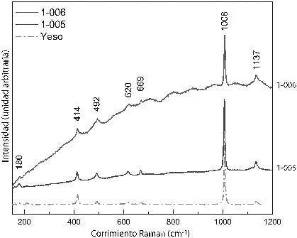 Para los análisis de ER se observaron las muestras al microscopio y se identificaron zonas de color blanquecino en contraste con otras oscuras. Se estimó que estas últimas correspondían a material de arrastre del soporte cerámico y que no aportaban información sobre la sustancia responsable del color. Todas las mediciones se realizaron sobre las zonas claras. Los resultados de ER indican la presencia de yeso en las muestras tomadas de las piezas 1-005 (FNG) y 1-006 (Belén), identificado con un pico muy intenso en 1008 cm-1 (Kosztolanyiet al. 1987). No se detectó ningún compuesto adicional. En la Figura 3 se presentan los resultados obtenidos y un espectro patrón de yeso (CaSO4.2H2O) para su comparación.