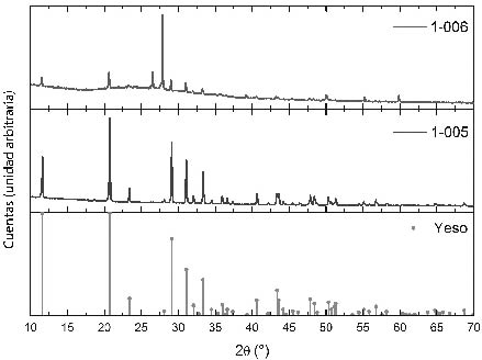 Los resultados de DRX permiten identificar la presencia de yeso en las muestras de las piezas 1-005 y1-006, como se indica en la Figura 4. Además, se observan picos asociados a cuarzo en la muestra 1-005;mientras que en la pieza 1-006 se detecta un feldespato, posiblemente anortoclasa ((Na,K)AlSi3O8) o albita (NaAlSi3O8) y cuarzo (SiO2). La presencia de anortoclasa, un feldespato alcalino, es altamente probable que sea producto del método de extracción de la muestra, que arrastró, junto con la sustancia, parte del soporte cerámico (Figura 4).