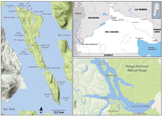 La isla Victoria es una de las diez islas presentes en el lago Nahuel Huapi. Se localiza en el extremo suroeste de la provincia de Neuquén, al límite con la provincia de Río Negro, sobre el lago Nahuel Huapi, en el Parque Nacional homónimo (Figura 1). Se encuentra separada del continente desde el final del Último Máximo Glacial (Lirio 2011). Tiene una superficie aproximada de 37 km2, lo que la convierte en la isla de mayor envergadura dentro de la cuenca lacustre del Nahuel Huapi. Presenta una morfología alargada en el sentido noroeste-sudeste (ca. 20 km) y delgada (entre 250 m a 4 km). Su punto más cercano al continente se encuentra en el extremo noroeste, a 1,7 kilómetros de la península de Quetrihué. En su interior presenta una serie de serranías bajas, que no superan los 1025 msnm (Cerro Quemado).