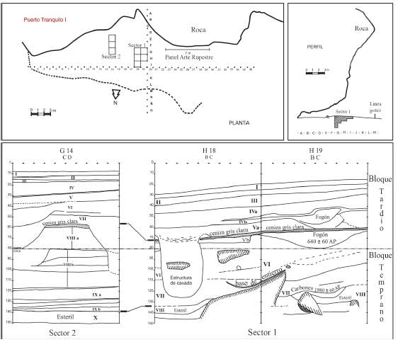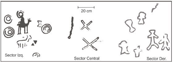 Por otra parte, en los niveles tempranos del sector 1 se recuperó también una inhumación primaria completa de cúbito lateral izquierdo en posición fetal. Los análisis preliminares sobre estos restos indican que se trata de un probable adulto masculino, sin deformación craneal (Hajduk 1989-1990) y rasgos somáticos adscribibles a poblaciones canoeras de la vertiente pacífica de los Andes (Hajduk et al. 2011). Por su parte, PT1 se destaca por contener un extenso panel rupestre con una importante cantidad y variedad de diseños. Estas pinturas fueron ejecutadas sobre un único panel de 7,17 m de extensión, con un ancho promedio de 1 m; se trata de un soporte rocoso muy apto para ejecutar los diseños debido a su topografía plana y lisa. En general, los diseños suelen iniciarse a 0,76 m y culminan a 2,3 m por encima del piso actual. Todos los motivos fueron producidos con color rojo, con variantes de la misma tonalidad. En cuanto a la distribución de los diseños, se aprecian tres sectores (Figura 4). El sector central, compuesto por motivos geométricos simples tales como cruciformes, círculos y líneas ondulantes simples de trazo vertical grueso. El sector izquierdo del panel (este) presenta la mayor concentración de diseños, donde se destacan motivos figurativos tales como zoomorfos cuadrúpedos de cuerpo lleno y de contorno lineal, asociados a motivos geométricos. En este sector, la presencia de un diseño zoomorfo cuadrúpedo con apéndice sobre su lomo ha sido interpretado por Pedersen (1963, 1978) como la representación intencional de un jinete montado, o bien, de un animal de carga. Por su parte, en el sector derecho (oeste) se aprecian también diseños figurativos que representan motivos antropomorfos de contorno lineal. Estos diseños se vinculan topográficamente con motivos geométricos de tipo “clepsidras”, lo que sugiere alguna relación visual intencional.