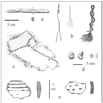 a: fragmento de posible perforador óseo; b: cordelería en posible cabello humano, en fibra animal y en fibra vegetal; c: cuatro fragmentos de piel de guanaco unidos con costura de tendón (dos fragmentos pintados con pigmento rojo; d: Cuentas de Hamalopoma sp. y bivalvo marino indeterminado; e: Fragmentos de cerámica con decoración incisa y punzonada alineada doble paralelo sobre superficie pulida.