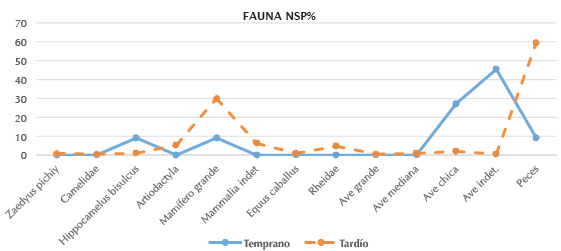 Lo siguen en orden de importancia numérica la categoría “Mamífero grande” (NSP = 64) y “Mammalia indet.” (NSP = 58), a lo que se suman Artiodactyla (NISP = 11); Hippocamelus (NISP = 3) y un único resto de Camelidae (NISP = 1). Considerando el total de restos asignados a estas categorías (NSP), sólo 17 fragmentos se identificaron anatómicamente (NISP). En todos los casos, corresponden a los miembros traseros y delanteros y, en menor medida, a cráneo. Siguen Equus (fragmentos craneales) y Zaedyus (placas del caparazón), con dos fragmentos en cada caso. Las aves continúan en importancia (NISP = 26), aunque en el caso de Rheidae se trata de cáscara de huevo (NISP = 10) y se encuentran aún bajo análisis. Lo mismo ocurre con los moluscos bivalvos (Diplodon) y los microvertebrados, en particular roedores, que aparecen en toda la secuencia pero aún no fueron cuantificados. Pese al tamaño reducido de la muestra, sobre todo en el bloque temprano, podemos señalar que en las capas tardías, las categorías “Mamífero grande” y “Peces” se encuentran comparativamente más representadas, mientras que en las tempranas predominan las aves chicas e indeterminadas y, en menor medida, el huemul (Figura 5).