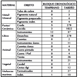 En el sector 1 (5 m2 de superficie) se obtuvieron dos fechados radiocarbónicos sobre muestras de carbón de fogones (Figura 2). El primer fechado es de 640 ± 60 AP (LP. N° 273) y proviene de la capa V(b); y el segundo es de 1980 ± 60 AP (LP. N° 204) y corresponde a la capa VII (última capa arqueológicamente fértil). Se observa cierta correspondencia entre los dos sectores excavados (Figura 2), definidos estos por una capa fina de ceniza volcánica que selló el depósito (Villarosa et al. 2006). Operativamente, para este trabajo, se definieron dos bloques cronológicos. El bloque temprano, caracterizado por la ausencia de recipientes cerámicos entre ca. 2000 AP y 640 AP; y el bloque tardío, comprendido por los niveles con presencia de cerámica, pos 640 AP (Figura 2). En la tabla 2 se resumen la diversidad y frecuencia de materiales recuperados en PT1 (excepto las arqueofaunas). Se observa un amplio espectro de materiales de distinto origen (Figura 3).