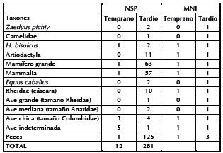 La frecuencia total de restos óseos recuperados alcanza los 283 especímenes, más diez fragmentos de cáscara de huevo de Rheidae (Tabla 3). De estos, 271 (95,33%) más los diez fragmentos de cáscara de huevo de Rheidae provienen de los niveles tardíos, mientras que sólo 12 (4,66%) corresponden a los componentes iniciales del sitio. A nivel general, el grupo taxonómico mayoritario son los peces (NISP = 126), que corresponden al menos a cuatro especies: Percicthys trucha (perca) (NISP = 83) y Odonthestes hatcheri (pejerrey) (NISP = 39) y dos especies indeterminadas (NISP = 4).