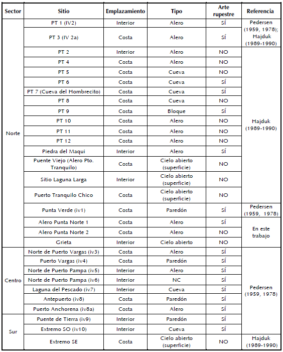 Las prospecciones iniciales realizadas por Hajduk en la década de 1980 se orientaron a la identificación de sitios y a la excavación de contextos estratigráficos (Hajduk 1989-1990, 1995-1996). Los nuevos trabajos, iniciados en 2016, se enfocaron en la revisita de los sitios ya conocidos y en la búsqueda dirigida de nuevos contextos en el sector norte de la isla (Tabla 1). La estrategia metodológica abordada en este trabajo incluye, en primera instancia, ofrecer una visión preliminar de la diversidad y frecuencia de sitios en el contexto general de la isla e integrarla en una escala local a partir de la presentación sintetizada del sitio PT1. Este sitio es el único que cuenta con cronología, y se destaca por el volumen excavado, la diversidad y la frecuencia de materiales. Si bien parte de estos datos han sido parcialmente mencionados en publicaciones previas (Albornoz 1996, 2003; Hajduk y Albornoz 1999; Albornoz y Cúneo 2000; Albornoz y Hajduk 2007, 2009), aún no han sido presentados en forma integrada.