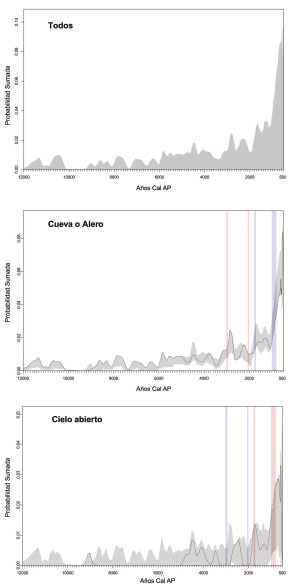 La Distribución de Probabilidad Sumada de los fechados calibrados a lo largo del tiempo muestra un patrón caracterizado por una frecuencia relativamente baja y continua, con valores de alrededor de 0.05 de probabilidad sumada, entre 6500 y 12.000 años cal. AP, aunque con un hiato de ca. 500 años −entre 9500 y 10.000 años cal. AP− sin evidencia de ocupación humana en la región (Figura 2). Después del 6500 AP y hasta ca. 3500 años cal. AP, la intensidad de ocupación humana aumenta en Neuquén a una tasa moderada, ya que presenta un decrecimiento relativo entre ca. 3000 y 4000 años cal. AP. Entre el contacto hispano-indígena y los 3000 años cal. AP, la cantidad de fechados aumentó a una tasa mucho mayor que la registrada hasta ese momento, y alcanza valores de aproximadamente 0.10 de probabilidad sumada (Figura 2). Es de destacar que cuando consideramos los fechados en cuevas y aleros de manera separada de los sitios a cielo abierto, el aumento observado en el Holoceno tardío es pronunciado, aunque en menor medida (Figura 2). En este sentido, la ausencia de fechados para sitios a cielo abierto se relacionaría con factores tafonómicos (Surovell et al. 2009).