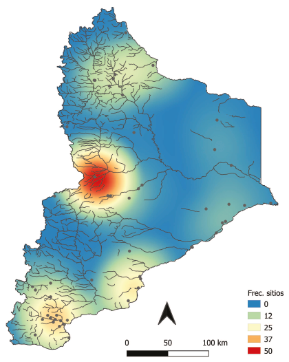 Bernal y colaboradores (2017) señalaron que la distribución de los sitios de entierros humanos en el espacio presenta un patrón no-aleatorio y heterogéneo, ya que exhibe una tendencia al agrupamiento de sitios en sectores particulares del espacio y que la mayor parte de los detectados corresponden al Holoceno tardío en un rango temporal que se extiende entre los 4600 años cal. AP y momentos históricos. Es de remarcar que Bernal y colaboradores (2017) también mostraron que la distribución espacial de los sitios bioarqueológicos se asocia fuertemente con los cursos de agua permanentes, como también se puede observar en la Figura 3 para todos los tipos de sitios en la región. En este sentido, la mayor frecuencia de ocupación humana en el oeste de la provincia se observa tanto con base en los sitios bioarqueológicos como para los arqueológicos en general, lo cual podría indicar cambios representativos de aquellos ocurridos en el pasado, aun cuando se incluyen posibles sesgos en el muestreo.