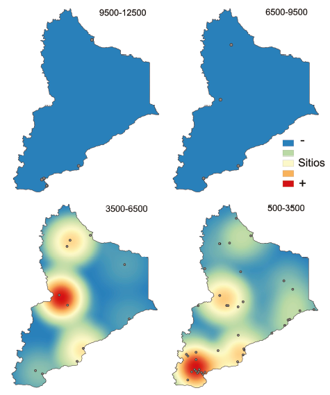 Figura 4. Distribución geográfica de la densidad de fechados radiocarbónicos por períodos a partir del método espacial de Kernel.