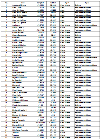 De los 54 sitios (Figura 1) compilados en la base de datos, 26 corresponden a sitios a cielo abierto, 15 a cuevas y 13 a aleros; en tanto que, del total de sitios, 19 presentan entierros humanos y 35 pueden ser asignados a actividades múltiples. Es de destacar que en la base final de fechados (N = 142), los sitios en cueva y alero −distribuidos de manera similar en los diferentes sectores de la provincia− son los que presentan una mayor frecuencia de fechados (n = 108), en relación con los sitios a cielo abierto (n = 34). En este mismo sentido, todas las dataciones calibradas (cal.) que superan los 5000 años AP −con la excepción de un fechado del sitio Aquihuecó de ca. 9000 años cal. AP− corresponden a sitios en cuevas. El registro bioarqueológico mostró una gran profundidad temporal y una frecuencia mayor de sitios datados en el Holoceno tardío final. Asimismo, los datos de sitios de actividades múltiples muestran diferencias en la frecuencia en distintos momentos y espacios geográficos; es destacable que la cantidad de datos disponibles es menor en el norte de la provincia y que la mayor parte de los fechados tempranos se realizaron sobre materiales hallados en cuevas del sur de esta (Tabla 1S).