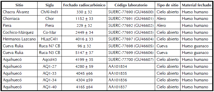 Se generó una base de datos que contiene un total de 172 fechados radiocarbónicos georreferenciados publicados, correspondientes a sitios arqueológicos a cielo abierto, cuevas y aleros y entierros humanos de la provincia del Neuquén, noroeste de Patagonia, Argentina (Figura 1, Tabla 1, Tabla 1S). Estos fechados fueron realizados a partir de hueso humano y de fauna, carbón y cerámica mediante técnicas de radiocarbono convencional y espectrometría de masa con aceleradores (AMS), así como por termoluminiscencia. Asimismo, se determinó la edad radiocarbónica (AMS) de un conjunto de 12 muestras óseas de humanos y fauna recuperados en excavaciones de diversos sitios arqueológicos de la provincia. En este trabajo se presentan fechados para los sitios Chacra Álvarez, Hermanos Lazcano y Aquihuecó (Dpto. de Chos Malal), Chorriaca (Dpto. Loncopué), Piera (Dpto. Picunches), Cochico-Márquez (Dpto. Pehuenches) y Cueva Ruka (Dpto. Añelo) (Tabla 2). Con excepción de Aquihuecó (Della Negra y Novellino 2005; Della Negra et al. 2009) y Hermanos Lazcano (Della Negra et al. 2014), ambos ubicados en el departamento de Chos Malal, ninguno de los sitios contaba con dataciones radiocarbónicas previas. Las nuevas dataciones fueron realizadas en el Scottish Universities Environmental Research Centre (SUERC; Scotland, UK) y en el Arizona Radiocarbon AMS facility (University of Arizona).