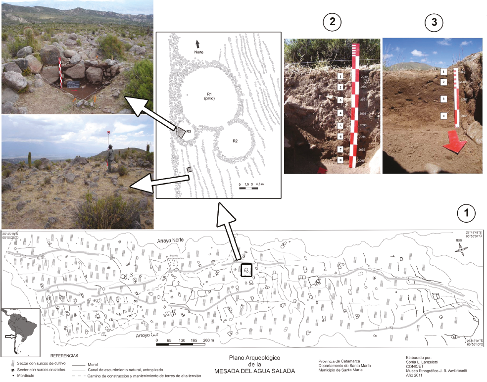 El presente trabajo se diseñó con el propósito de establecer, en la Mesada del Agua Salada (valle de Yocavil, provincia de Catamarca), la posible contemporaneidad entre el piso de ocupación de una unidad arquitectónica de tipo habitacional y el suelo desarrollado en las estructuras agrícolas adyacentes, utilizando el análisis estratigráfico y de contenido de microrrestos silíceos –principalmente fitolitos– como línea de evidencia. Se trata de un estudio realizado a escala local, orientado a profundizar el conocimiento acerca de los procesos de ocupación y reocupación de este espacio a lo largo del tiempo desde la perspectiva de la arqueología del paisaje (sensu Criado Boado 1991), acercamiento teórico que viene siendo aplicado satisfactoriamente para comprender la compleja historia ocupacional del valle de Caspinchango (Lanzelotti 2012; Lanzelotti y Spano 2015).