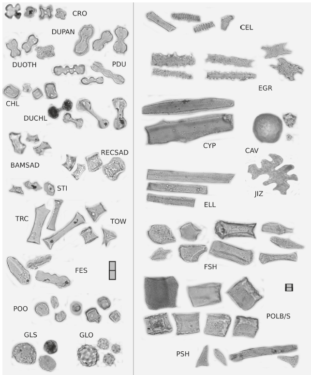 Para finalizar, se destaca que en los niveles superiores existe un marcado incremento en la variedad y abundancia de los fitolitos panicoides, y una mayor presencia de fitolitos bilobados y los de forma de cruz, con algunas formas que pueden estar vinculadas con la presencia de maideas.
